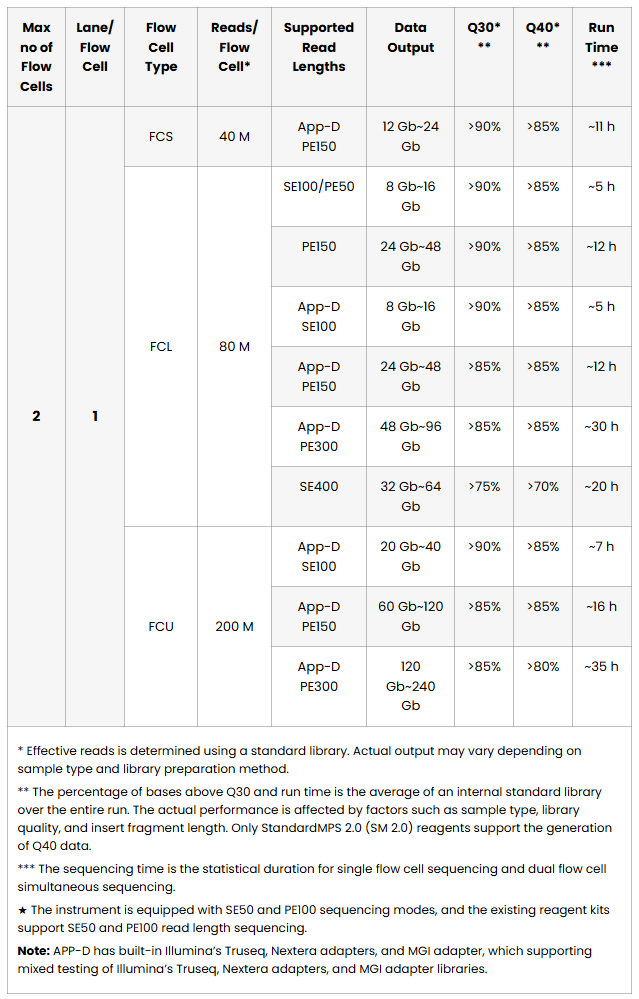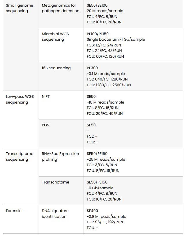 SE50 for NIPT and low-pass WGS. SE100 and PE150 for the bulk of standard applications. PE300 for 16S metagenomics and long-amplicon work, delivering up to 240 Gb per run on dual FCU flow cells. And SE400 for forensic DNA applications and extended-read requirements.