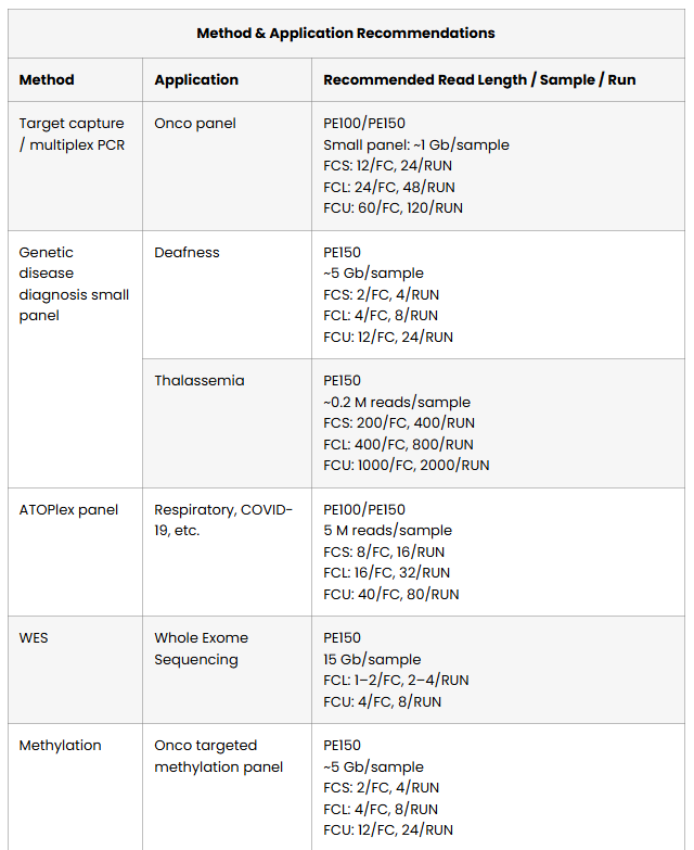 FCS (40M reads), FCL (80M reads), and FCU (200M reads) — covering applications from small targeted panels through to whole-exome sequencing.