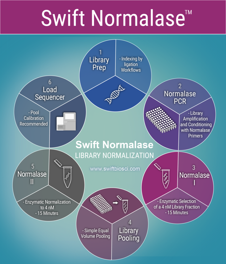 The Normalase™ workflow eliminates the need for using library quantification and insert size determination to individually adjust concentrations prior to library pooling, enabling equal volume pooling for mid- to high-throughput sequencing labs.